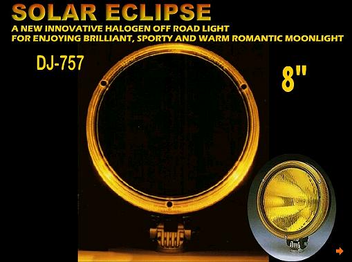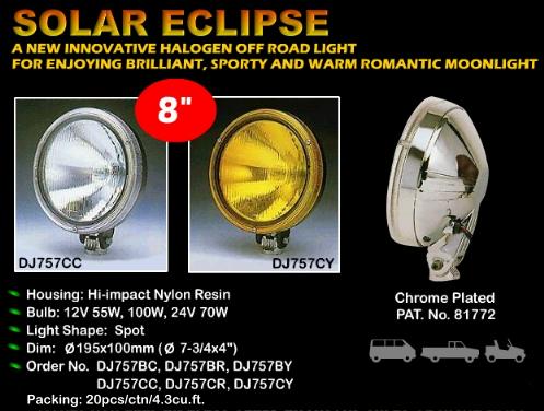 SPECIFICATION SOLAR ECLIPSE Provide a solar power of halogen 55W or 100W to turn the night into day. When camping, fishing, dancing, picnic or swimming, it provide a warm romantic moonlight to recreate your energy for tomorrow. In parking lot, it is a parking light. Chrome-plated, black and walnut finished housing are both available. Pat no. Des.81772 COLOR OPTION ITEM No. PACKING DJ757BC 20pcs/ctn/4.3cu.ft.